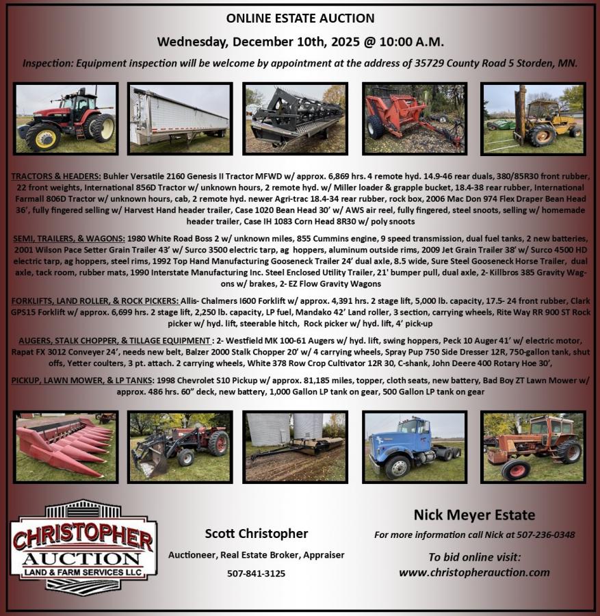 Christopher Auction Land & Farm Services LLC. specializes in auctions, real estate sales, as well as farmland & equipment appraisals. We market and sell all types of agricultural real estate, commercial, farmland, acreages, lake, and developmental properties.