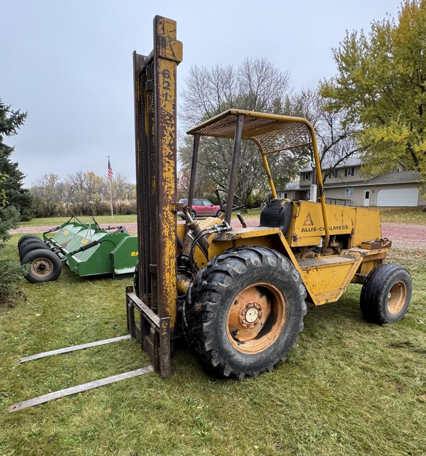FORKLIFTS, LAND ROLLER, & ROCK PICKERS: Allis- Chalmers I600 Forklift w/ approx. 4,391 hrs. 2 stage lift, 5,000 lb. capacity, 17.5- 24 front rubber, Clark GPS15 Forklift w/ approx. 6,699 hrs. 2 stage lift, 2,250 lb. capacity, LP fuel, Mandako 42’ Land roller, 3 section, carrying wheels, Rite Way RR 900 ST Rock picker w/ hyd. lift, steerable hitch, Rock picker w/ hyd. lift, 4’ pick-up